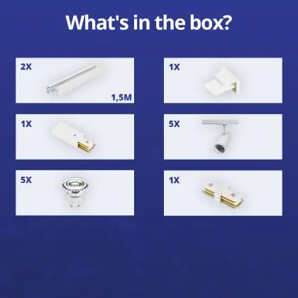 Beschreibung Komplettset 1-Phasen Rail 3 Meter Weiß | incl. 5x Spot + GU10 2700K 3W Dimmbar + Abschlusskappe, Stromanschluss und I-Verbinder