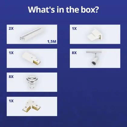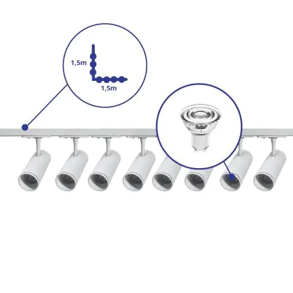 Beschreibung Komplettset 1-Phasen Rail L 1,5 x 1,5 Meter Weiß | incl. 8x Spot + GU10 2700K 3W Dimmbar + Abschlusskappe, Stromanschluss und L -Verbinder