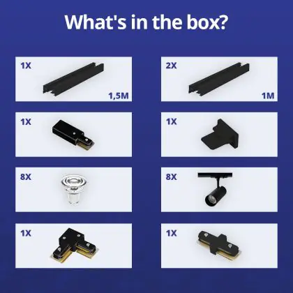 Beschreibung Komplettset 1-Phasen Rail L 1,5 x 2 Meter Schwarz | incl. 8x Spot + GU10 2700K 3W Dimmbar + Abschlusskappe, Stromanschluss und L -Verbinder