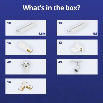 Beschreibung Komplettset 1-Phasen Rail L 1 x 1,5 Meter Weiß | incl. 4x Spot + GU10 2700K 3W Dimmbar + Abschlusskappe, Stromanschluss und L -Verbinder