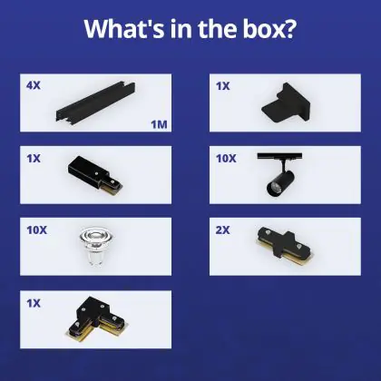 Beschreibung Komplettset 1-Phasen Rail L 2 x 2 Meter Schwarz | incl. 10x Spot + GU10 2700K 3W Dimmbar + Abschlusskappe, Stromanschluss und L -Verbinder