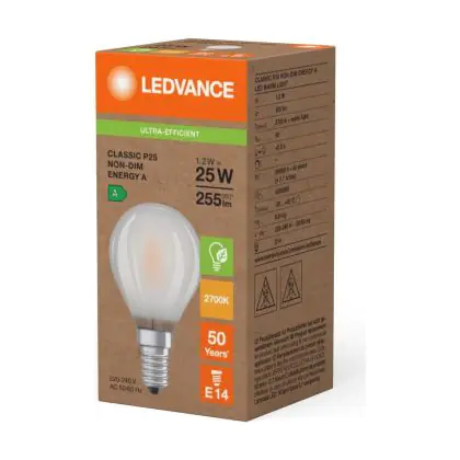 Die Ledvance LED Classic E14 Birne Fadenlampe Matt 1.2W 255lm - 827 Extra Warmweiß | Ersatz Für 25W ist eine effiziente E14 LED-Lampe mit Retrodesign und der perfekte Ersatz für Ihre konventionellen 25W Lampen mit E14. Zudem strahlt sie Licht in der Farbtemperatur 2700K - Extra Warmweiß aus und punktet durch eine lange Lebensdauer.