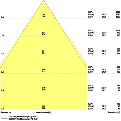 Beispiel: Wird eine Lampe mit einem Abstrahlwinkel von 60 Grad an der Decke (2,5 m Höhe) angebracht, erzeugt sie einen Lichtkegel von 2,9 Metern Durchmesser. Hat die Lampe hingegen einen Abstrahlwinkel von 120 Grad, beträgt der Lichtkegel 8,7 Meter im Durchmesser. |