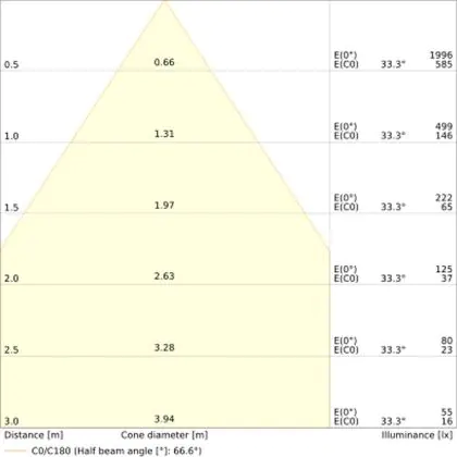 Beispiel: Wird eine Lampe mit einem Abstrahlwinkel von 60 Grad an der Decke (2,5 m Höhe) angebracht, erzeugt sie einen Lichtkegel von 2,9 Metern Durchmesser. Hat die Lampe hingegen einen Abstrahlwinkel von 120 Grad, beträgt der Lichtkegel 8,7 Meter im Durchmesser. |