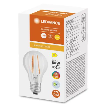 Die Ledvance Superior Classic LED E27 Birne Fadenlampe Klar 5.8W 806lm - 927 Extra Warmweiß | Dimmbar - Höchste Farbwiedergabe ist eine effiziente E27 LED-Lampe mit Retrodesign und der perfekte Ersatz für Ihre konventionellen 60W Lampen mit E27. Zudem strahlt sie Licht in der Farbtemperatur 2700K - Extra Warmweiß aus und punktet durch eine lange Lebensdauer.