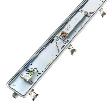 Die LED-Feuchtraumleuchte mit integriertem LED-Treiber von Philips hat eine Länge von 120 cm. Das Noxion-Produkt ersetzt zwei herkömmliche Leuchten à 36 Watt. Selbst verbraucht es nur 38 Watt, wodurch eine schnelle Amortisation gewährleistet ist. Diese LED hat eine kaltweiße Farbtemperatur (4.000 Kelvin). Sie ist IP66- und IK08-klassifiziert und kann als Notfallbeleuchtung eingesetzt werden.