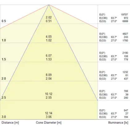 Beispiel: Wird eine Lampe mit einem Abstrahlwinkel von 60 Grad an der Decke (2,5 m Höhe) angebracht, erzeugt sie einen Lichtkegel von 2,9 Metern Durchmesser. Hat die Lampe hingegen einen Abstrahlwinkel von 120 Grad, beträgt der Lichtkegel 8,7 Meter im Durchmesser. |