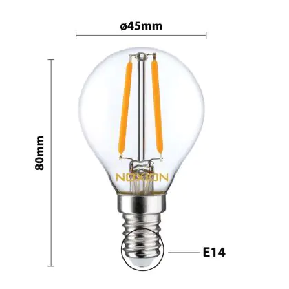 | Herstellername | Noxion Lucent Filament LED Lustre P45 E14 220-240V 2.5W 250LM CRI80 2700K NON-DIM (25W eqv.) | |