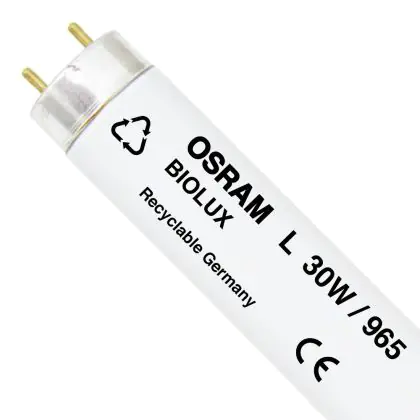 Die Osram Biolux T8 30W - 965 Tageslichtweiß | 90cm ist eine T8 Leuchtstoffröhre von Osram mit einer Länge von 900 mm. Das Produkt verfügt über 2 Pins und hat einen Durchmesser von 26 mm. Die Röhre strahlt Licht in der Farbtemperatur 6500K - Tageslichtweiß aus und punktet durch eine lange Lebensdauer.