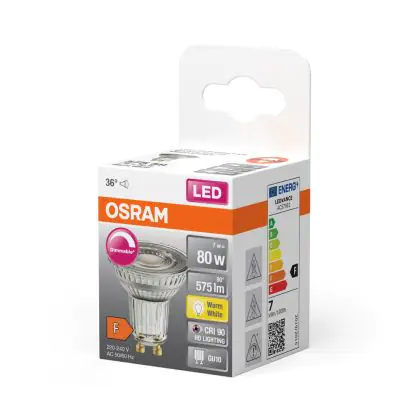 Die Osram LED Superstar Reflektor Spot GU10 PAR16 8.3W 575lm 36D - 927 Extra Warmweiß | Höchste Farbwiedergabe - Dimmbar - Ersatz Für 80W ist eine effiziente GU10 LED-Lampe und der perfekte Ersatz für Ihre konventionelle Halogenlampe mit 80W und einem GU10-Sockel, bei welchem die zwei Stifte einen Abstand von 10 mm zueinander haben. Zudem strahlt das Produkt Licht in der Farbtemperatur 2700K - Extra Warmweiß aus und punktet durch eine lange Lebensdauer.