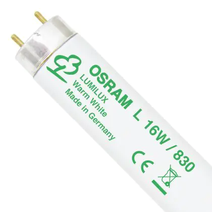 Die Osram T8 Lumilux ES 16W - 830 Warmweiß | 60cm ist eine T8 Leuchtstoffröhre von Osram mit einer Länge von 600 mm. Das Produkt verfügt über 2 Pins und hat einen Durchmesser von 26 mm. Die Röhre strahlt Licht in der Farbtemperatur 3000K - Warmweiß aus und punktet durch eine lange Lebensdauer.