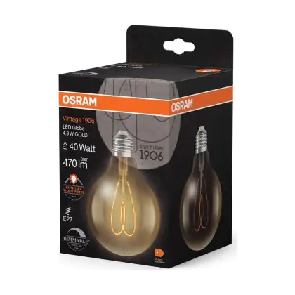 Die Osram Vintage 1906 LED E27 Globe Fadenlampe Gold 4.9W 470lm - 922 Extra Warmweiß | Höchste Farbwiedergabe - Dimmbar - Ersatz Für 40W ist eine effiziente E27 LED-Lampe mit Retrodesign und der perfekte Ersatz für Ihre konventionellen 40W Lampen mit E27. Zudem strahlt sie Licht in der Farbtemperatur 2200K - Extra Warmweiß aus und punktet durch eine lange Lebensdauer.