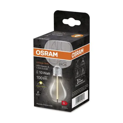 Die Osram Vintage 1906 LED E27 Special Fadenlampe Klar 1.8W 100lm - 827 Extra Warmweiß | Ersatz Für 15W ist eine effiziente E27 LED-Lampe mit Retrodesign und der perfekte Ersatz für Ihre konventionellen 15W Lampen mit E27. Zudem strahlt sie Licht in der Farbtemperatur 2700K - Extra Warmweiß aus und punktet durch eine lange Lebensdauer.