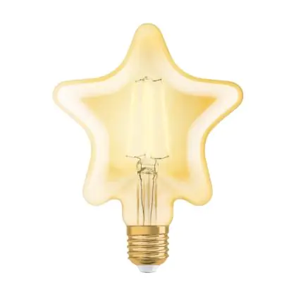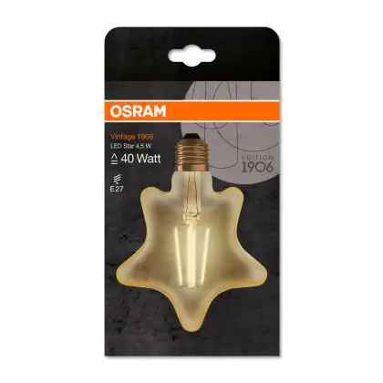 Die Osram Vintage 1906 LED E27 Star 4.5W 825 Gold | Ersetzt 40W ermöglicht enorme Energieeinsparungen von bis zu 90 %. Dank des Standard-E27-Sockels klappt der Umstieg auf LED besonders einfach. Die Goldbeschichtung und die sichtbaren Filamentstäbe im Inneren des Leuchtkörpers machen die Vintage-LED zu einem echten Highlight. Der Leuchtkörper ist begeistert mit einer Stern-Form.