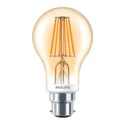 Die Philips Classic LED Glühbirne B22 Birne Gold 7.5W 600lm - 820 Extra Warmweiß | Dimmbar - Ersatz für 60W ist eine effiziente B22 LED-Lampe und der perfekte Ersatz für Ihre konventionelle Halogenlampe mit 48W und einem B22-Sockel (Bajonettsockel). Zudem strahlt das Produkt Licht in der Farbtemperatur 2000K - Extra Warmweiß aus und punktet durch eine lange Lebensdauer.