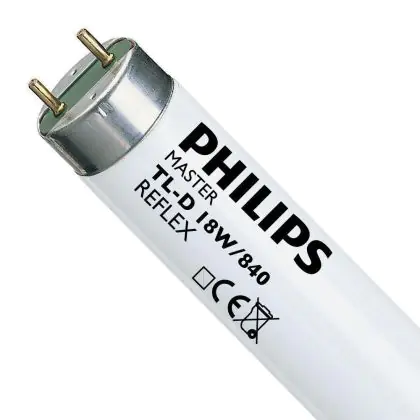 Die Philips MASTER TL-D Reflex 18W - 840 Kaltweiß | 60cm ist eine Leuchtstoffröhre mit einer Länge von 600 mm. Das Produkt hat einen Durchmesser von 28 mm. Die Röhre strahlt Licht in der Farbtemperatur 4000K - Kaltweiß aus und punktet durch eine lange Lebensdauer.